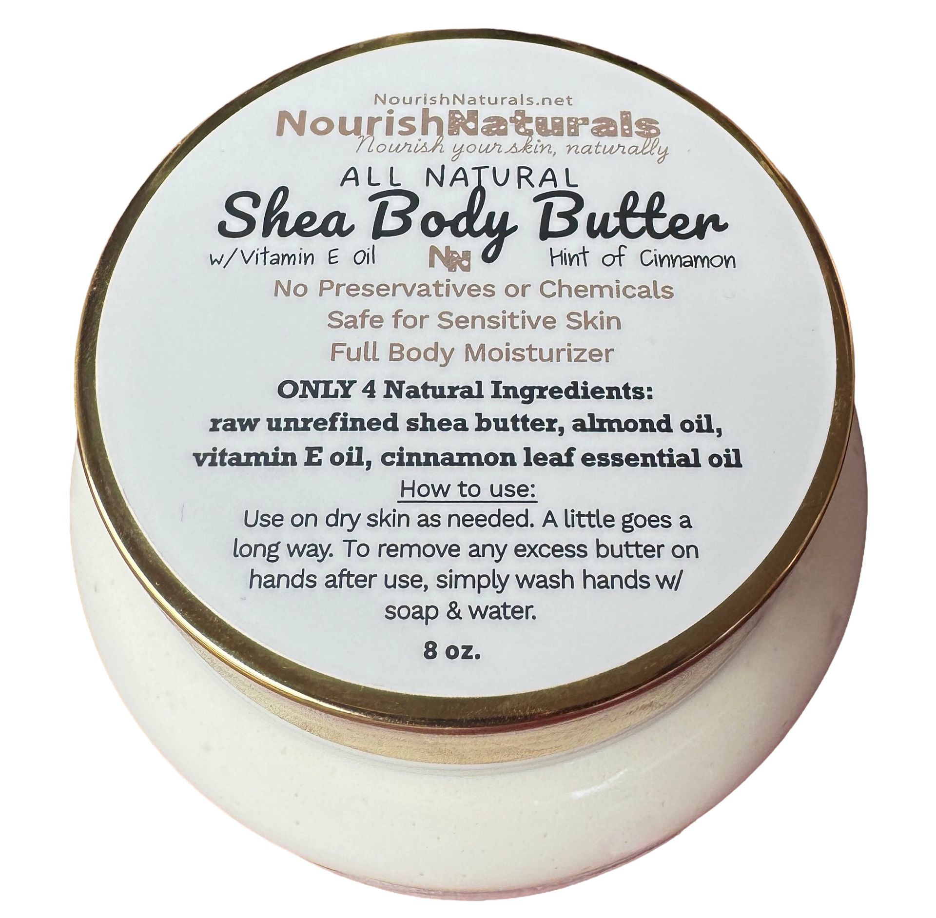 At NourishNaturals, we pride ourselves on using only the finest natural ingredients. Our products are handmade with raw unrefined shea butter as our #1 ingredient, almond oil, vitamin E oil, essential oils, and cane turbinado raw sugar in our scrub. We never use chemicals or preservatives!